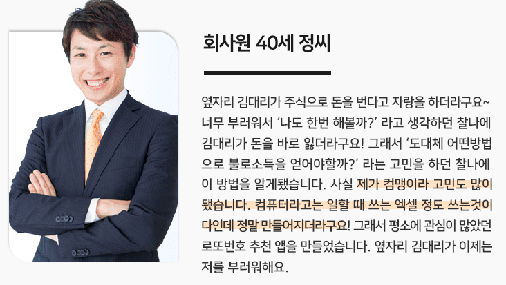 40세 회사원 정 씨는 평소에 관심이 많았던 로또 번호 추천 앱을 만들고 그 앱으로 수익을 얻고 있다고 합니다.