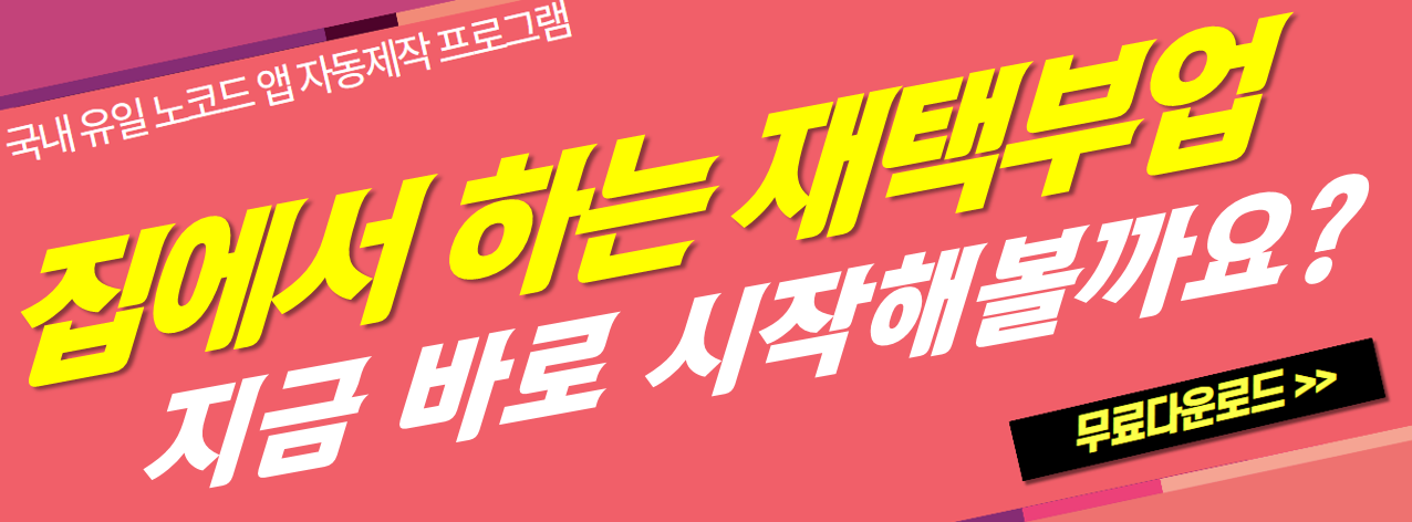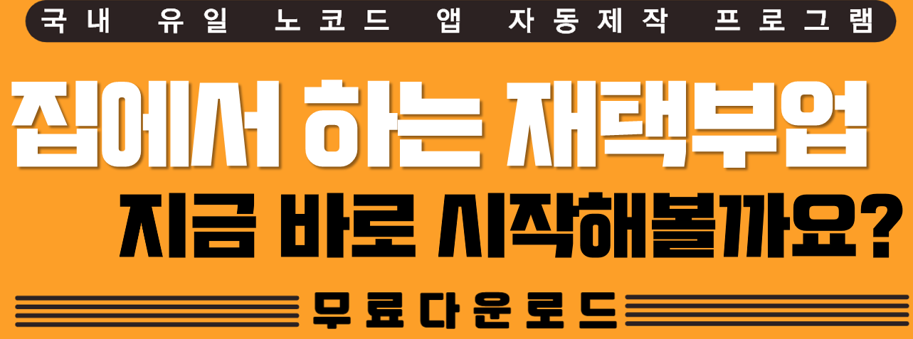 집에서 하는 재택부업 '어플만들기'는 직장 생활을 하면서 여유시간에 앱을 만들 수 있고, 언제 어디서나 컴퓨터나 노트북 하나로 가능하며, 가장 좋은 점은 다른 집에서 하는 재택부업과는 다르게 앱을 한번 만들어 놓기만 하면 내가 직접적인 노동을 하지 않아도 어플을 사용하는 사람만 있다면 밥을 먹으면서도, 놀면서도, 심지어는 자면서도 수익을 얻을 수 있습니다.