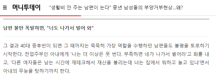 뿐만 아니라, 이러한 상황에서 남편들의 불만까지 폭발하게 되면 주부들은 더욱 설자리가 없어지기도 합니다.