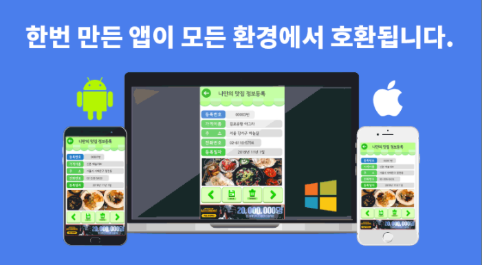 즉, 삼성 갤럭시, LG 벨벳, 아이폰, 샤오미, 화웨이 등 모든 핸드폰에서 호환되고 갤럭시 탭, 아이패드 등 모든 IT 기기에서 호환되는 앱을 쉽게 만들 수 있습니다.