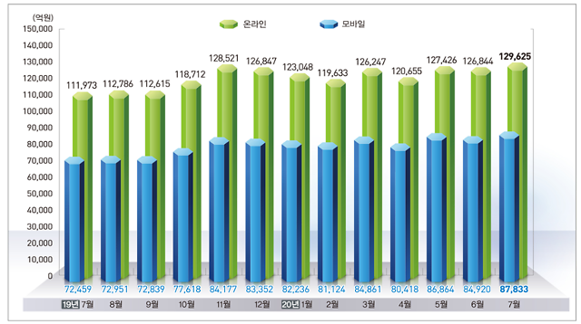 코로나19로 인한 오프라인 시장의 어려움에도 올해 7월 온라인 쇼핑 거래액은 13조에 육박하고 있으며 그중 모바일 판매는 8조 7000억 원으로 동월 대비 21.2%나 증가했습니다.