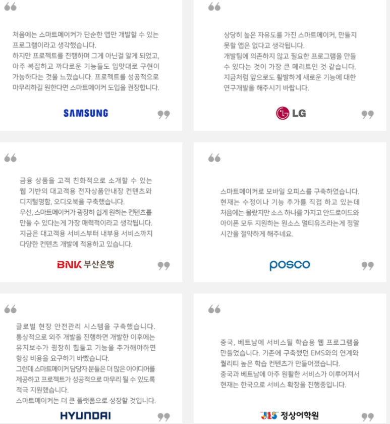 개인뿐만 아니라 대기업이나 관공서 같은 곳에서도 스마트메이커를 사용하고 있습니다.
