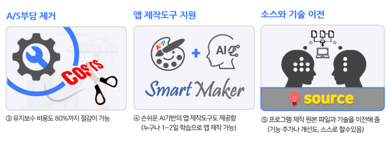 그래서 스마트메이커는 이러한 문제점을 해결하기 위해, 앱 제작 원본 파일의 기술을 이전해 주고 제작도구인 스마트메이커 프로그램까지 모두 제공해드리기 때문에 기능추가나 앱 개선도 아주 쉽게 진행할 수 있습니다.
