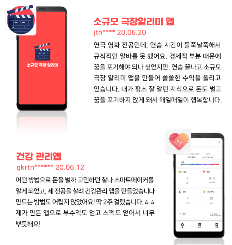실제 스마트메이커를 이용해서 앱을 만들고 투잡을 하고 있는 사람들의 사례입니다.