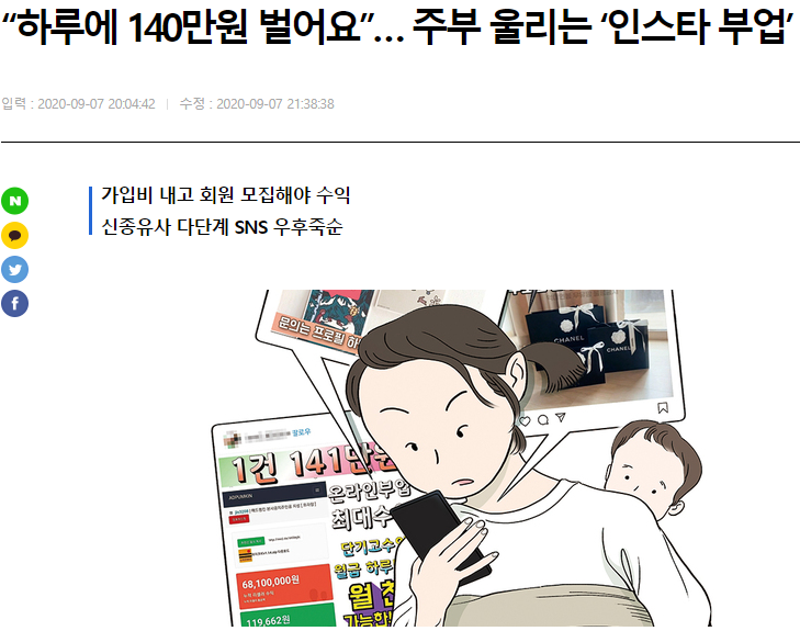 그리고 최근에는 클릭만으로 돈을 번다고 거짓말을 하고 선입금 등을 하는 댓글 알바나, 가입을 유도하는 다단계 같은 것들이 있어 많은 사람들의 피해가 잇따르고 있습니다. 이러한 방법은 절대 해서는 안 됩니다.
