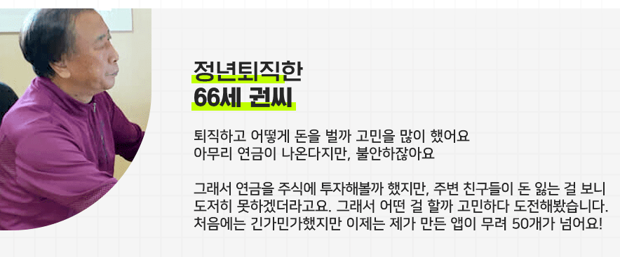 평생을 아이들을 가르치고 은퇴한 교장선생님 권 씨는 퇴직금으로 주식에 투자하려 했으나, 투자하지 않고 스마트메이커로 앱을 만들었고, 현재 만든 앱이 50개가 넘습니다. 이 사례는 유명해져 뉴스에도 보도되었습니다.