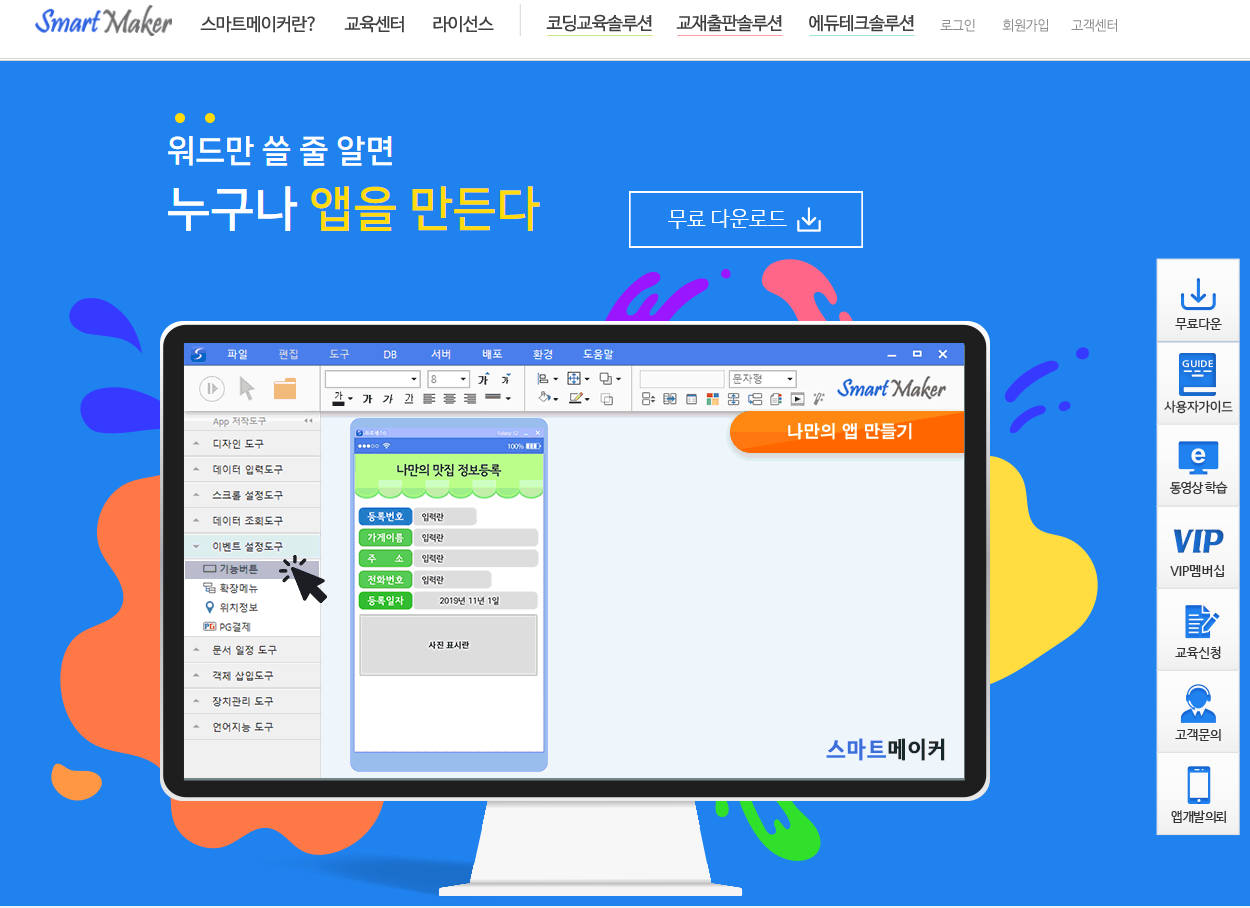 그래서 한국에 유일한 노코드 프로그램 '스마트메이커'가 각광받고 있습니다.