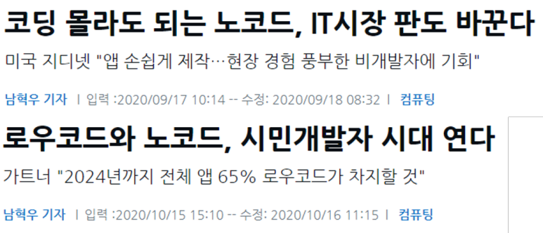 그래서 각광받는 것은 바로 '노코드' '코딩 없이' 앱을 만드는 것입니다.