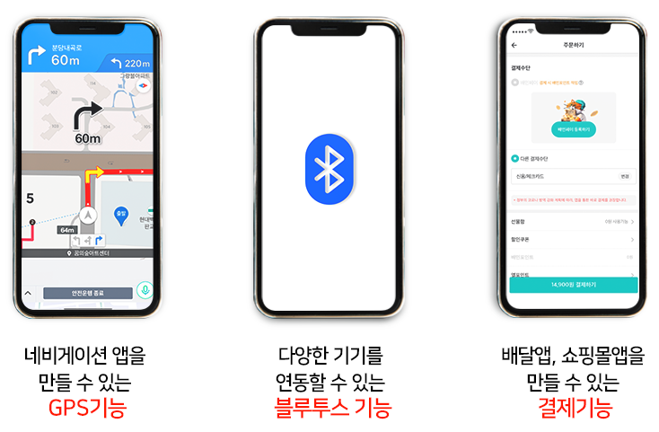 내비게이션 앱을 만들 수 있는 GPS 기능, 다양한 기기를 연동할 수 있는 블루투스 기능, 배달 앱 쇼핑몰 앱을 만들 수 있는 결제 기능, 데이터베이스 연동 등 다양한 기능들을 활용하여 앱을 만들 수 있습니다.
